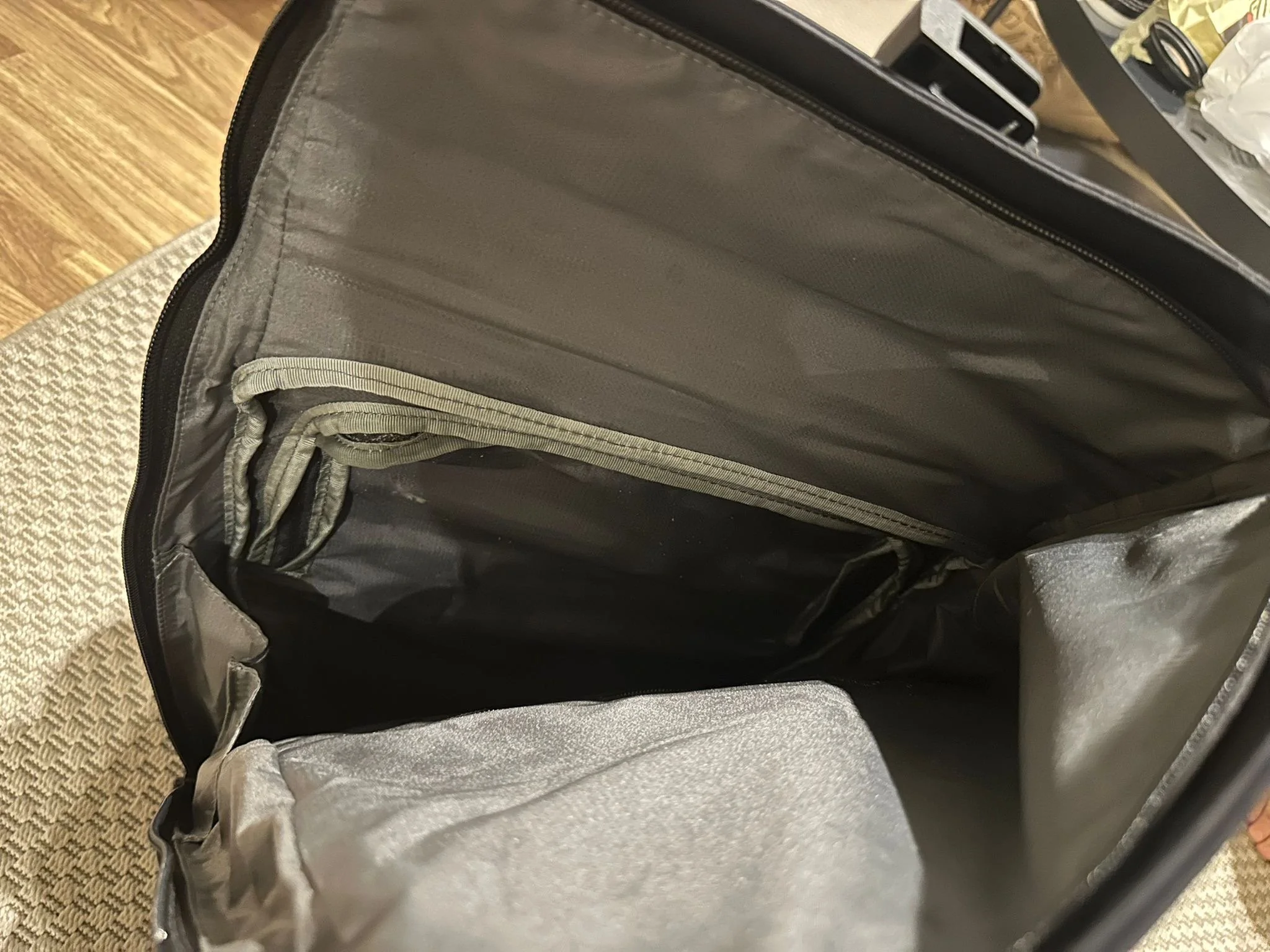 Inside, it’s refreshingly simple: one large main compartment, two flat sleeves, and a padded laptop section at the back.